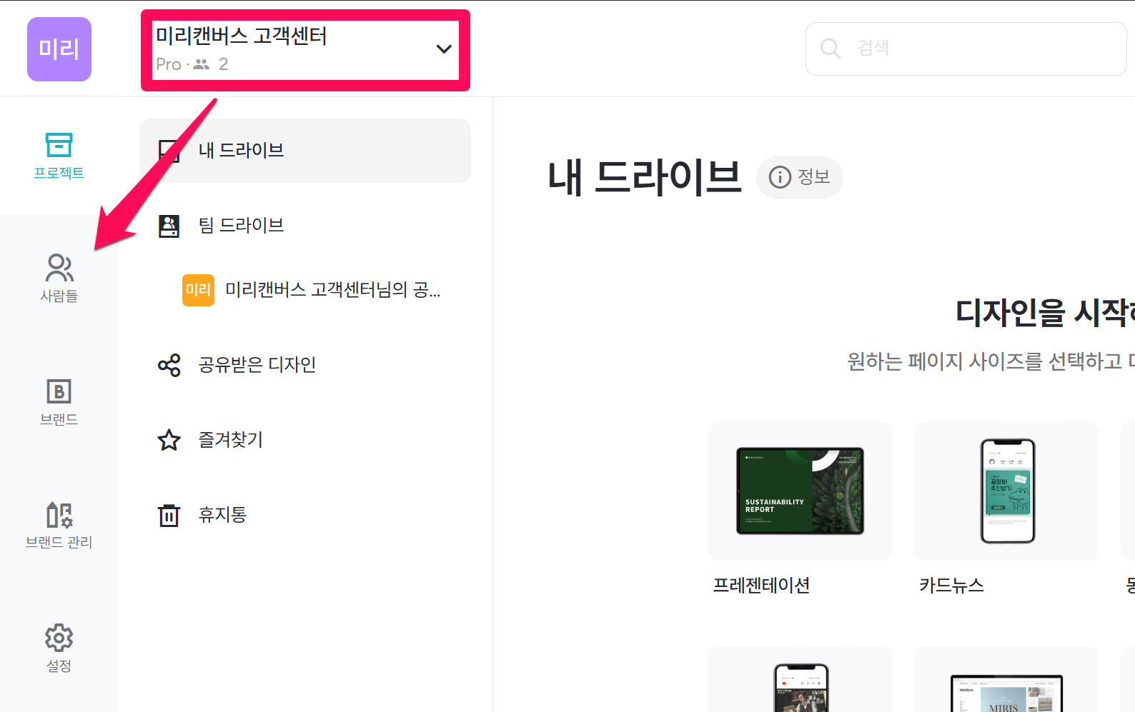 ①소유권을 이전할 워크스페이스로 전환한 뒤, 왼쪽의 [사람들] 메뉴로 이동합니다.