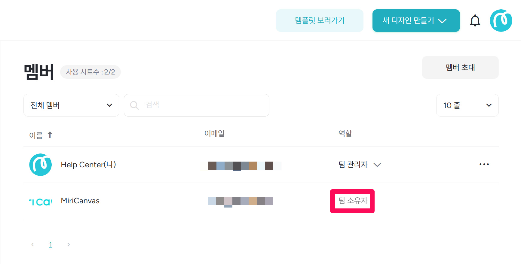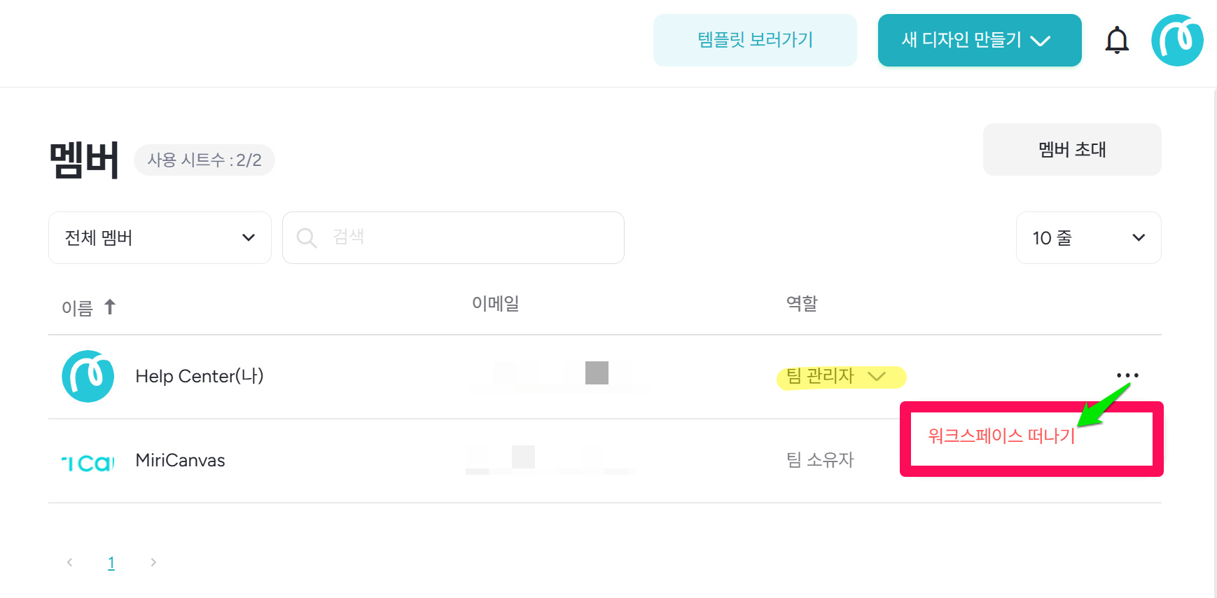 ※'팀 관리자' 계정으로 로그인 시 '워크스페이스 떠나기' 버튼이 보이고, 변경된 소유자 계정으로 로그인 시 '멤버 제거' 버튼이 보입니다.