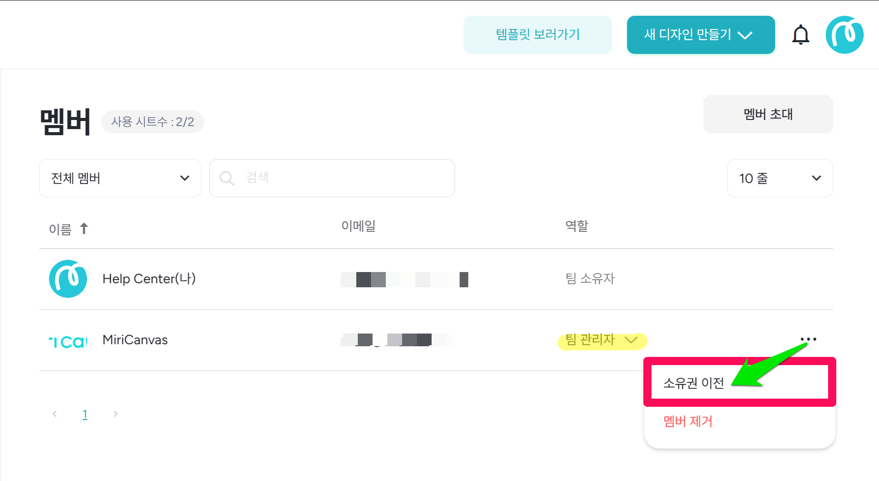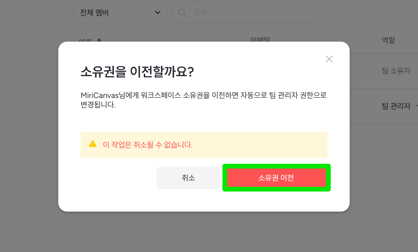 ※소유권 이전을 완료하면, 기존의 소유자의 역할이 자동으로 '팀 관리자'로 변경됩니다.