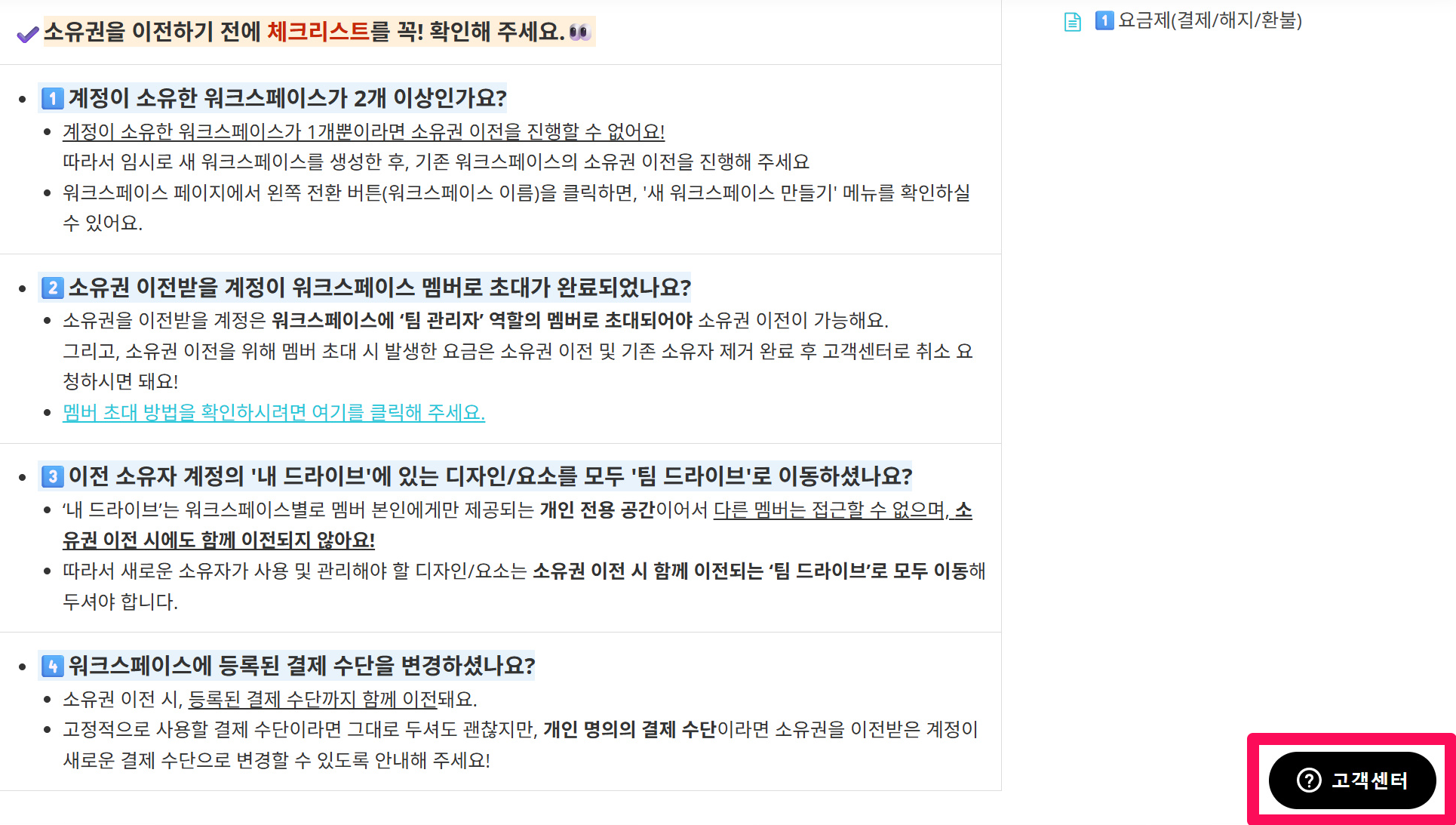 ⑥멤버 제거까지 완료하셨다면, 화면 오른쪽 하단의 고객센터 버튼을 클릭해 취소 요청을 접수해 주세요.